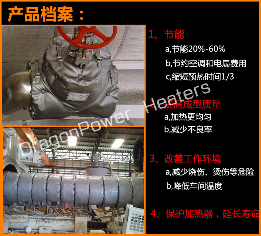 主要用于注塑機、擠出機模具和模頭的加熱器上。也可用于管道、彎頭、法蘭、人孔、三通、化學反應(yīng)釜、火電核電汽輪機組、燃機機組、熱交換器、發(fā)動機排氣管等的保溫、隔熱。